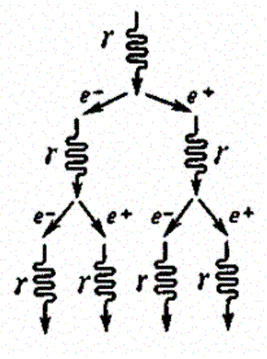 В составе вторичного космического излучения можно выделить два компонента: мягкий (сильно поглощается свинцом) и жесткий (обладает в свинце большой проникающей способностью). Происхождение мягкого компонента объясняется следующим образом. В космическом пространстве всегда имеются g -кванты с энергией Е > 2mес2, которые в поле атомных ядер превращаются в электронно-позитронные пары (см. § 263). Образовавшиеся таким образом электроны и позитроны, тормозясь, в свою очередь, создают g -кванты, энергия которых еще достаточна для образования новых электронно-позитронных пар и т. д. до тех пор, пока энергия g -квантов не будет меньше 2mес2 (рис. 348). Описанный процесс называется электронно-познтронно-фотонным (или каскадным) ливнем. Хотя первичные частицы, приводящие к образованию этих ливней, и обладают огромными энергиями, но ливневые частицы являются «мягкими» — не проходят через большие толщи вещества. Таким образом, ливневые частицы — электроны, позитроны и g -кванты — и представляют собой мягкий компонент вторичного космического излучения. Природа жесткого компонента будет рассмотрена в дальнейшем (см. § 270).