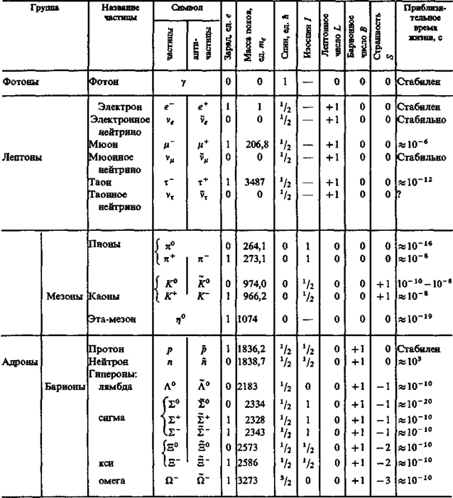 В табл. 8 элементарные частицы объединены в три группы (см. § 272): фотоны, пептоны и адроны. Элементарные частицы, отнесенные к каждой из этих групп, обладают общими свойствами и характеристиками, которые отличают их от частиц другой группы.