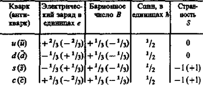 Согласно модели Гелл-Манна — Цвейга, все известные в то время адроны можно было построить, постулировав существование трех типов кварков (и, d, s)и соответствующих антикварков (ũ, d̃, s̃),если им приписать характеристики, указанные в табл. 9 (в том числе дробные электрические и барионные заряды). Самое удивительное (почти невероятное) свойство кварков связано сих электрическим зарядом, поскольку еще никто не находил частицы с дробным значением элементарного электрического заряда. Спин кварка равен 1/2, поскольку только из фермионов можно «сконструировать» как фермионы (нечетное число фермионов), так и бозоны (четное число фермионов).