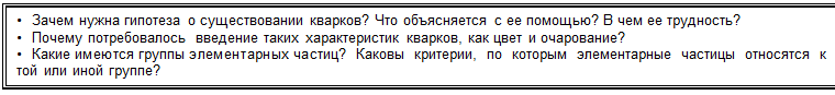 Кварковая модель оказалась весьма плодотворной, она позволила определить почти все основные квантовые числа адронов. Например, из этой модели, поскольку спин кварков равен 1/2, следует целочисленный (нулевой) спин для мезонов и полуцелый — для барионов в полном соответствии с экспериментом. Кроме того, эта модель позволила предсказать также и новые частицы, например W--гиперон. Однако при использовании этой модели возникают и трудности. Квар ковая модель не позволяет, например, определить массу адронов, поскольку для этого необходимо знание динамики взаимодействия кварков и их масс, которые пока неизвестны.