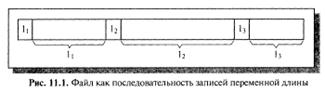 Другой способ представления файлов - последовательность записей переменной длины, каждая из которых содержит ключевое поле в фиксированной позиции внутри записи (см. рис. 11.1). Базисная операция в данном случае — считать запись с каким-либо значением ключа. Записи могут располагаться в файле последовательно (например, отсортированные по значению ключевого поля) или в более сложном порядке. Метод доступа по значению ключевого поля к записям последовательного файла называется индексно-последовательным.