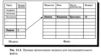 устройстве, что и сам файл, и состоит из списка элементов, каждый из которых содержит идентификатор записи, за которым следует указание о местоположении данной записи. Для поиска записи вначале происходит обращение к индексу, где находится указатель на нужную запись. Такие файлы называются индексированными, а метод доступа к ним — доступ с использованием индекса.