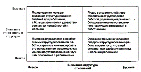 Исследования Университета штата Огайо считаются наиболее значительными среди тех, которые были предприняты в послевоенный период в области лидерского поведения [5]. Их целью была разработка двухфакторной теории руководства. За основу были взяты две переменные: структура отношений и отношения в рамках этой структуры. К первой переменной относятся образцы поведения, с помощью которых лидер организует и определяет структуру отношений в группе: определение ролей, установление коммуникационных потоков, правил и процедур работы, ожидаемых результатов. Вторая переменная включает образцы поведения, отражающие уровень или качество отношений между лидером и последователями: дружественность, взаимное доверие и уважение, симпатия и гармония, чувствительность друг к другу, желание сделать друг другу доброе.