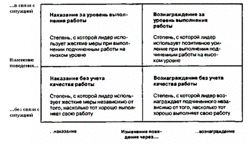 Концепция «вознаграждения и наказания» лидерского поведения основана на положениях теории о закреплении поведения, изложенной в гл. 1 учебника. В данной концепции лидер рассматривается в качестве человека, управляющего процессом изменения поведения подчиненных в желательном направлении. Концепция выделяет четыре типа лидерского поведения в зависимости от применения вознаграждения или наказания (рис.11.9).