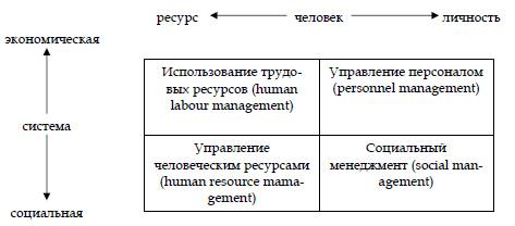 По оси ординат показано разделение концепций по тяготению к экономической или социальной системам, а по оси абсцисс — по рассмотрению человека как ресурса и как личности в процессе производства.
