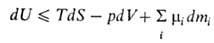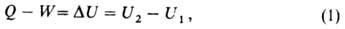 где U1 и U2 - внутренняя энергия системы в начальном и конечном состояниях соответственно. Уравнение (1) выражает закон сохранения энергии в применении к термодинамическим процессам, т.е. процессам, в которых происходит передача теплоты. Для циклического процесса, возвращающего систему в начальное состояние, Δ U = 0. В изохорных процессах, т.е. процессах при постоянном объеме, система не совершает работы за счет расширения, W = 0 и теплота, переданная системе, равна приращению внутренней энергии: Qv = Δ U. Для адиабатических процессов, когда Q = 0, Δ U = - W. Внутренняя энергия системы как функция ее энтропии S, объема V и числа молей mi i-того компонента представляет собой термодинамический потенциал. Это является следствием первого и второго начал термодинамики и выражается соотношением: