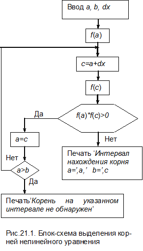 Блок-схема процедуры определения интервала приведена на рис.21.1. Сначала задается интервал [ a,b ], внутри и на границах которого существует функция f (x) и может находиться один из корней. Тут же указывается шаг поиска dx. Затем вычисляется значение функции на левой границе интервала в точке а и организуется цикл, в котором рассчитывается значение функции на расстоянии dx от точки а. Если на участке [ a,a+dx ] функция поменяла знак или приняла нулевое значение, т.е. произведение f(a)*f(b)£0, то это означает, что внутри участка [ a,a+dx ] существует корень уравнения. Если по условиям задачи требуется найти только один корень, то цикл на этом прекращается и производится вычисление корня с требуемой точностью одним из рассмотренных ниже методов. Если необходимо найти все корни уравнения, то выделение участков, содержащих корни, продолжается по аналогичной схеме.