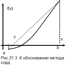 Соединив на графике значения функции на границах интервалов прямой линией, получим точку пересечения этой линии с осью абсцисс, которую будем рассматривать в качестве следующего приближения к корню уравнения. В соответствии с рис.21.3. координаты этой точки находятся из подобия треугольников: