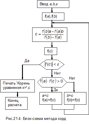 Блок-схема метода хорд приведена на рис.21.4. Она почти полностью повторяет блок-схему метода половинного деления. Отличия заключаются в расчете по иной формуле координаты точки с для дальнейшего уточнения корня и дополнительных переприсвоениях значений функций f (a)= f (c) или f (b)= f (c) при сокращении интервала неопределенности.