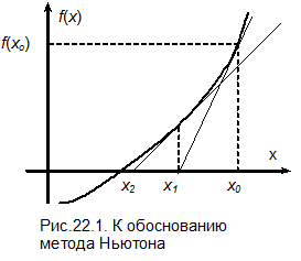 На рис.22.1. показана схема итерационных вычислений корня уравнения по методу Ньютона. Для начала расчета должны быть заданы начальная точка x0 и допустимая погрешность e. В точке x0 вычисляются значения функции f (x) и ее производной