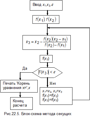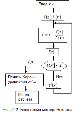 Блок-схема метода Ньютона приведена на рис. 22.2. Если нулевое приближение выбрано достаточно близко к корню, то скорость сходимости велика. К достоинствам этого метода следует отнести также то, что для начала расчета не требуется указывать диапазон, на котором функция меняет знак, а достаточно выбрать только начальную точку.