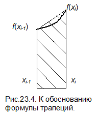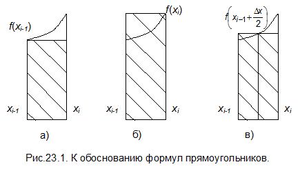 Если вычислять значение функции не на краях, а в середине интервала, то, согласно рис.23.1.в, можно ожидать увеличения точности, поскольку завышенные значения площади по сравнению с истинными на одной стороне прямоугольника компенсируются заниженными значениями на другой стороне. Площадь заштрихованного прямоугольника будет равна