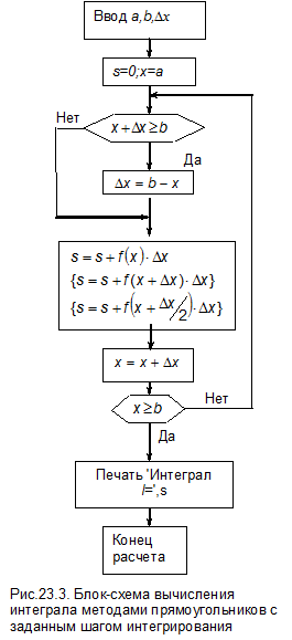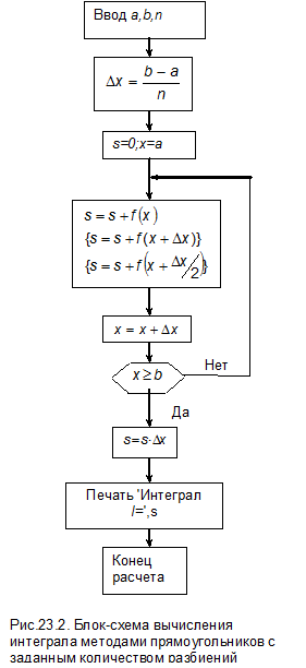 Блок-схема метода прямоугольников с заданным количеством разбиений приведена на рис. 23.2.