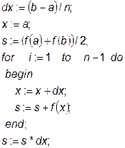 Вычисления по методу трапеций также могут быть организованы как с заданным количеством подинтервалов n, так и с заданной величиной шага D x. В блок-схемах алгоритмов на рис.23.2 и рис.23.3 изменится только узел вычисления интегральной суммы: