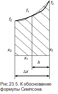 . Чтобы определить коэффициенты a,b,c, необходимо на интервале аппроксимации задать три точки. Выберем шаг интегрирования D x и вычислим значения функции на концах интервала и в его середине. Обозначим, как это показано на рис.23.5, значения аргумента через x0, x1, x2 и, соответственно, значения функции через f0, f1, f2. Половину шага интегрирования обозначим