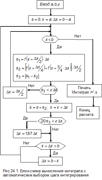 На рис. 24.1 приведена блок-схема адаптивного алгоритма вычисления определенного интеграла методом средних прямоугольников. В начале программы в качестве шага интегрирования выбирается длина всего диапазона интегрирования. Далее по двум формулам с целым и половинными шагами рассчитываются значения интеграла на участке шириной D x.