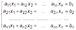 Здесь х1, х2, …,хn – неизвестные параметры, значения которых необходимо найти; а11, а12, …, а1n, а21, …, а2n, …, аnn – известные коэффициенты при неизвестных параметрах х1, х2, …,хп. Первый индекс коэффициента означает номер строки (номер уравнения в системе), второй индекс – номер неизвестного параметра, при котором стоит данный коэффициент; b1, … bn – свободные члены в уравнениях, индекс означает номер уравнения.