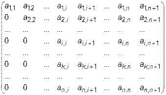 Пусть при прямом ходе были исключены коэффициенты из i- 1 столбцов. На этом этапе матрица коэффициентов имеет вид