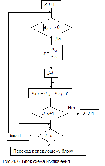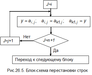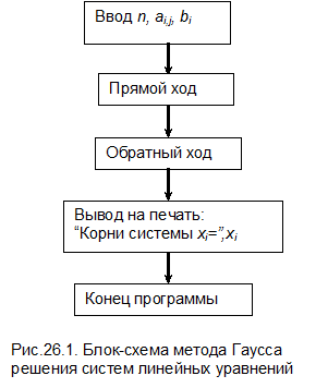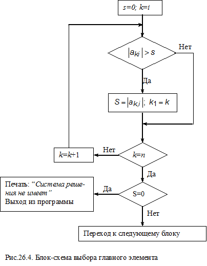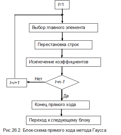 Общая блок-схема метода Гаусса и блок-схемы отдельных этапов приведены на рис.26.1-26.6.