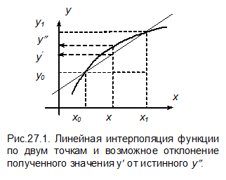 Поиск значения y (x) интерполяцией по двум точкам и появление возможной погрешности показано на рисунке 27.1.