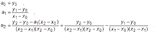 Более точной является интерполяция по трем точкам. В этом случае формула интерполяционного многочлена приобретает вид