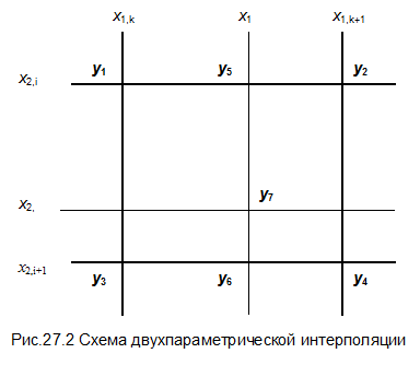 Расчетная схема двухпараметрической интерполяции показана на рис.27.2. Для того, чтобы избежать громоздких вычислений, сначала проводят интерполяцию по одному параметру при фиксированном другом, например по х 1, и определяют значения функции в точках y 5 и y 6, а затем по второму параметру при фиксированном первом и находят окончательное значение функции в искомой точке y 7.