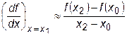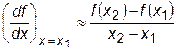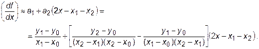 Первая производная наиболее просто вычисляется при аппроксимации функции f (x) прямой линией. В этом случае касательная к кривой в одной точке заменяется секущей, проходящей через две точки кривой. Для точки х1 производная может быть рассчитана по формулам: