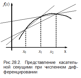 Эти формулы равноправны, хотя могут привести к различным результатам, как это показано на рис.28.2. Если интервалы x 2- x 1 и х 1- х 0 равны, то более точной будет формула