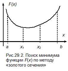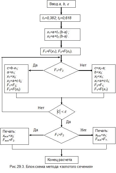 Спуск по этому направлению продолжается до достижения минимума целевой функции. Поиск этого минимума может быть осуществлен одним из методов однофакторной оптимизации, например, методом «золотого сечения». В точке минимума снова вычисляется значение градиента, определяется новое направление поиска и проводится однофакторная оптимизация. Процесс повторяется до тех пор, пока изменение координат локальных минимумов не станет пренебрежимо малым, т.е. будет выполнено условие