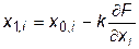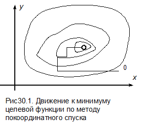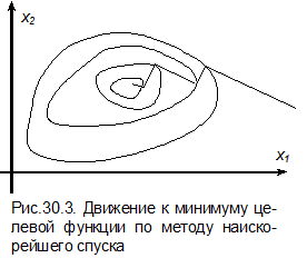 Этот метод является модификацией метода наискорейшего спуска. Идея метода показана на рис.30.4, блок-схема – на рис.30.5. Здесь в начальной точке рассчитывается градиент целевой функции, делается всего один шаг в наилучшем направлении без проведения одномерной оптимизации, в новой точке снова выбирается наилучшее направление, делается снова шаг и т.д. до достижения минимума.