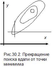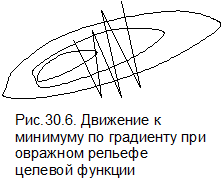гомерное пространство очень вытянуто по некоторым переменным, то образуется овраг. Траектория поиска состоит из шагов поперек оврага, а сходимость к минимуму слишком медленна. Подобная ситуация показана на рис.30.6. Иногда точное решение невозможно получить за приемлемое время.
