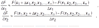 Как правило, целевые функции бывают достаточно сложными, поэтому частные производные рассчитываются по приближенным разностным формулам: