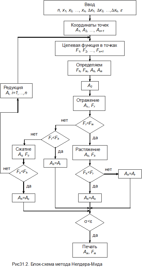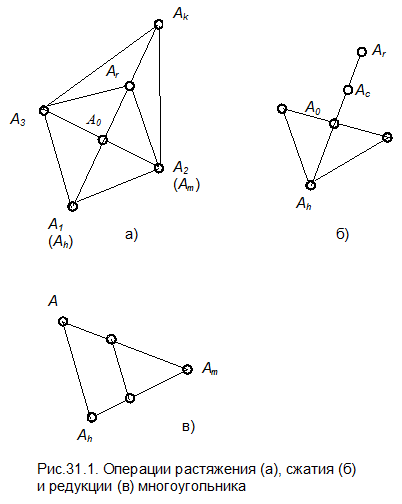 Операции растяжения, сжатия и редукции многоугольника показаны на рис.31.1, блок-схема метода – на рис.31.2.