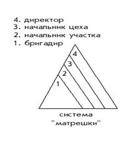 Система “матрешка” построена так, что права и ответственность вышестоящего руководителя полностью поглощают права и ответственность нижестоящих руководителей.
