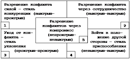 Исходя из данной модели выделяют пять способов разрешения конфликтов: