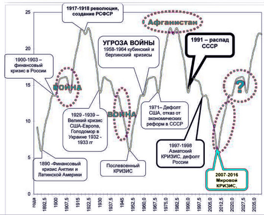 Как видно на подъеме и пике очередной волны происходит либо война, либо революция, на спаде – кризисы.