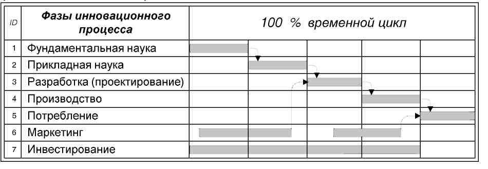Жизненный цикл инновации может быть представлен в виде ленточной диаграммы (рис. 2.3), отражающей последовательность и связь фаз инновационного процесса.