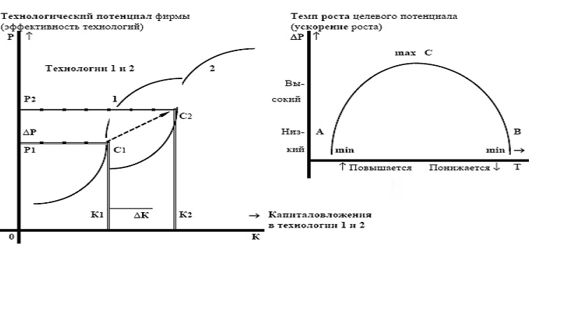 Технологический разрыв в инновационном процессе. Логистическая кривая помогает устанавливать сущность инновационных процессов. Инновационный цикл обычно начинается с ликвидации отставания фирмы в развитии ее потенциала, снижающим конкурентный статус. Особое внимание отводится технологическим инновациям. Основной характеристикой процесса здесь служит так называемый «технологический разрыв», который характеризует различие в потенциалах (эффективности) новой (2) и старой (1) технологий (ΔР=P2–P1), а также объем средств (ΔК=К2–К1), необходимых для вложения в новую технологию с целью достижения ею результативности, которую имеет на сегодня старая технология.