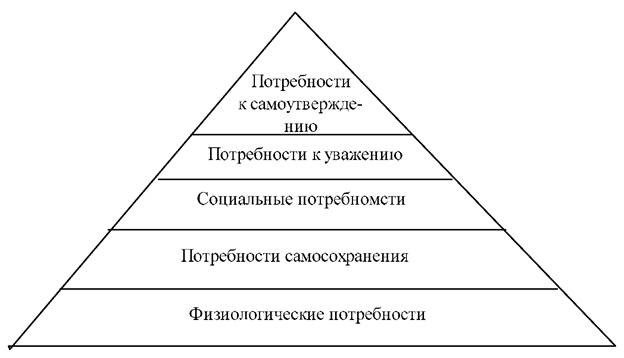 Согласно теории мотивации Маслоу, человеческие потребности располагаются в порядке иерархической значимости от наиболее до наименее настоятельных (рис.4): физиологические (голод, жажда, холод); потребности самосохранения (безопасность, защищенность); социальные потребности (общение, духовная близость); потребности в уважении (признание, статус), потребности в самоутверждении (саморазвитие, самовыражение).