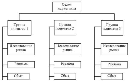 Сегментная структура организации маркетинговой службы состоит в специализации подразделений по группам обслуживаемых клиентов (рис.27). Иногда специалисту отдела маркетинга может быть поручено обслуживание всего лишь одного (очень важного) клиента. Этот подход позволяет приводить в соответствие емкость рынка и производственные возможности организации.