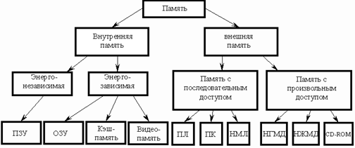 Памятью компьютера называется совокупность устройств для хранения программ, вводимой информации, промежуточных результатов и выходных данных. Классификация памяти представлен на рисунке: