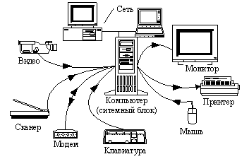 Компьютер обменивается информацией с внешним миром с помощью периферийных устройств. Только благодаря периферийным устройствам человек может взаимодействовать с компьютером, а также со всеми подключенными к нему устройствами. Любое подключенное периферийное устройство в каждый момент времени может быть или занято выполнением порученной ему работы или пребывать в ожидании нового задания. Влияние скорости работы периферийных устройств на эффективность работы с компьютером не меньше, чем скорость работы его центрального процессора. Скорость работы внешних устройств от быстродействия процессора не зависит. Наиболее распространенные периферийные устройства приведены на рисунке: