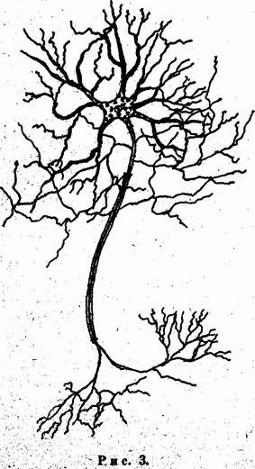 Нейрон, как это видно из рис. 3, представляет собой собственно нервную клетку с отходящим от нее множеством древовидно ветвящихся отростков (дендритов) и одним длинным отростком— нервным волокном, от которого также идут ответвления. Тело нейрона микроскопической величины (в среднем 0,03 мм), но нервное волокно может быть разной длины — до нескольких десятков сантиметров. В нейронах возникает процесс возбуждения. В основе возбуждения лежит особый нервный ток (биоток), который отличается от электрического. Нервное возбуждение распространяется со скоростью до 120 м в секунду. Но для человеческого тела это вполне достаточная скорость — ведь нервному возбуждению надо пройти расстояние не более 1,5—2 м. Нервные волокна покрыты белой жироподобной миелиновой оболочкой со свойствами изолятора. Эта оболочка играет очень важную роль, так как обеспечивает про ведение возбуждения в определенном направлении (без нее процесс возбуждения беспорядочно распространялся бы во все стороны).