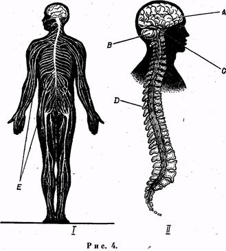 Различают центральную и периферическую нервную систему (рис. 4). Периферическая нервная система представляет собой совокупность нервных волокон, осуществляющих связь центральной нервной системы с различными частями тела и внутренними органами.