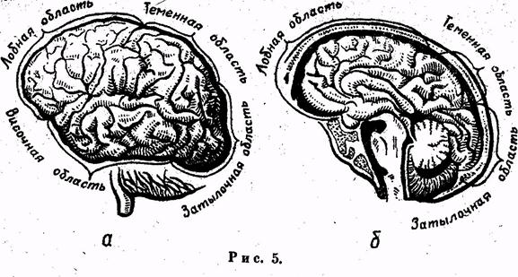 Головной мозг человека не представляет собой сплошной массы. Он состоит из ряда отделов, связанных друг с другом (ряс. 5). Нижний его отдел называется продолговатым мозгом, который соединяет спинной мозг с головным. Над продолговатым мозгом находятся средний мозг, мозжечок, еще выше — промежуточный мозг. Все эти отделы сверху покрыты большими полушариями,