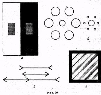 На рис. 20 показаны некоторые зрительные иллюзии. Серые прямоугольники одной и той же светлоты кажутся разными на черном и белом фоне: на черном фоне — светлее, чем на белом. Маленький круг среди больших кажется меньше такого же круга среди еще более маленьких. Трудно поверить, что изображенные на рисунке отрезки одинаковой длины, а линии в квадрате параллельны.