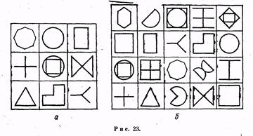 3. Убедитесь сами (и убедите в этом учащихся),, что узнавание — процесс более легкий, чем воспроизведение. Перерисуйте на крупном листе бумаги рис. 23,а>. Предложимте учащим*» в течение 30 «екун-д рассмотреть рисунок и, убрав его, попросите нарисовать те фигуры, которые дети запомнили (воспроизведение). Потом покажите рис. 23,6 и предложите узнать на этом рисунке те фигуры, которые они видели на р.ис. 23,а (узнавание). Сравните полученные результаты.