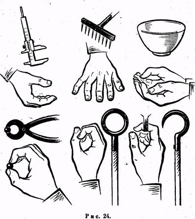 Источник творческой деятельности — общественная необходимость, потребность в том или ином новом продукте. Еще наши далекие предки на заре человеческой истории вынуждены были придумывать, изобретать новое для удовлетворения потребностей. Работая руками, люди видели ограниченность возможностей человеческих рук и начали изобретать простейшие орудия и приспособления, которые могли быстрее,и лучше выполнять функции рук (рис. 24). Роющая рука послужила прообразом лопаты; растопыренные пальцы, которыми человек сгребал сухие листья для подстилки, навели на мысль о граблях; сжатую в кулак руку он заменил молотком. В течение многих веков творческое воображение помогало человеку совершенствовать орудия труда.