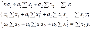 Система нормальных линейных уравнений МНК для оценки коэффициентов двухфакторной регрессии имеет вид: