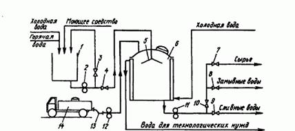 Для механизированного хранения и транспортирования жиров можно доставлять жиры с жиркомбинатов в разжиженном состоянии в термоизолированных цистернах. Схема бестарного приема, хранения и транспортирования жидкого жира приведена на рис. 4.